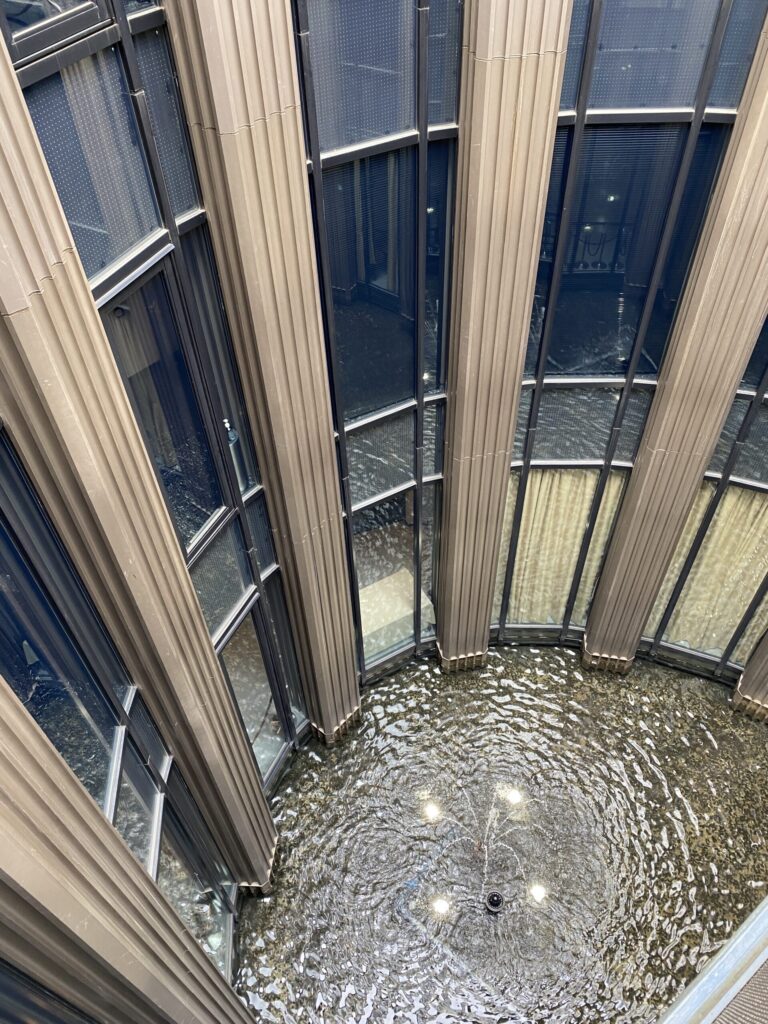 光の入る方を見ると中央に丸い吹き抜けがあり、下には噴水がありました。