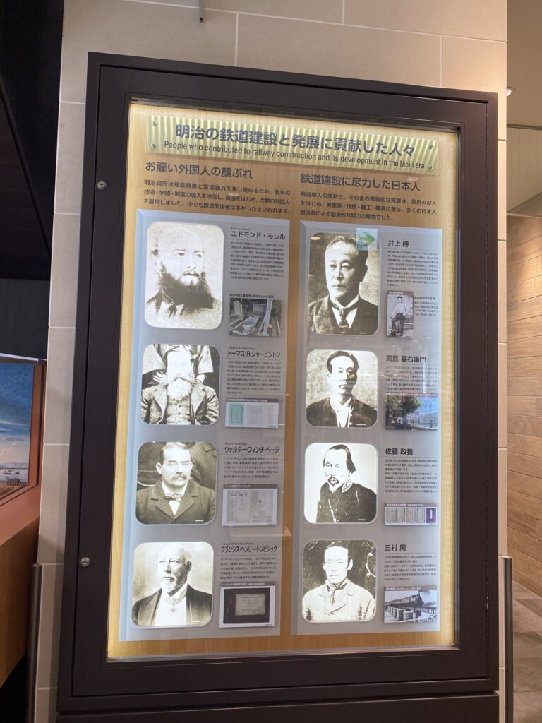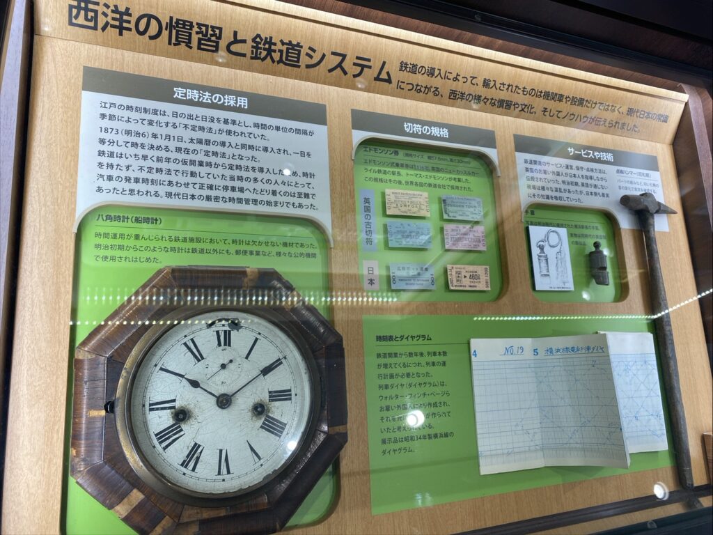 옛날 승차권과 자료도 전시되어 있어, 철도 개업 당시의 모습을 알 수 있었습니다. 설명에 따르면, 역무원 중에도 무사였던 사람이 많았고, 아직 에도 시대의 신분 의식이 남아 있었기 때문에 거만한 태도를 보이는 사람도 있었다고 합니다. 승객이 역장에게 깊이 인사하고 있었다는 기록도 있어, 현재 친절한 역무원의 이미지와는 달라 다소 의외였습니다.