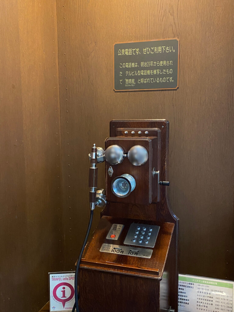 현관에 들어가면 메이지 시대에 사용되던 전화기의 모형이 전시되어 있습니다.