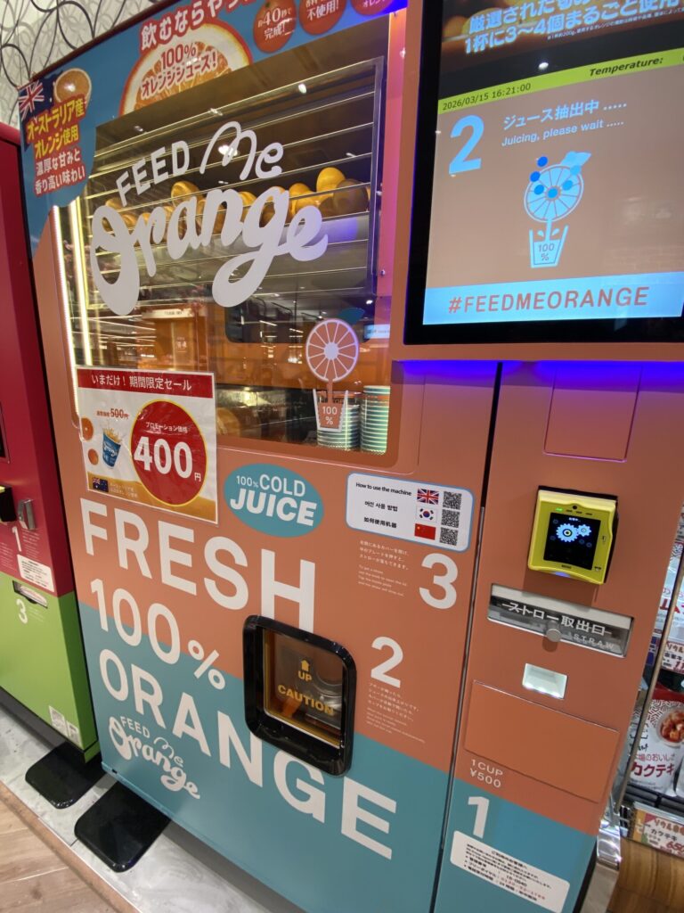 마크이즈 지하 1층에서 신선 100% 주스 자동판매기가 설치된 것을 발견했습니다. 예전부터 화제가 되고 있다는 건 알고 있었지만, 마실 기회가 별로 없었고, 이번에 딱 기간 한정 세일이라서 구매해봤어요.